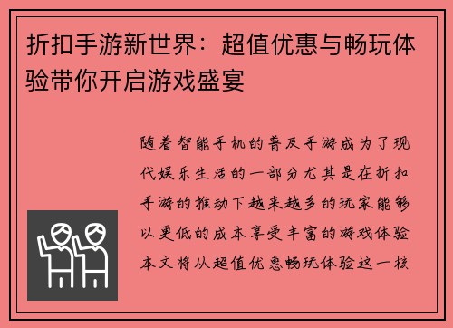 折扣手游新世界:超值优惠与畅玩体验带你开启游戏盛宴